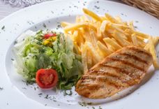 100/100/50/2 г • Куриное филе, картофель фри, микс салатов, томат Черри, зелень